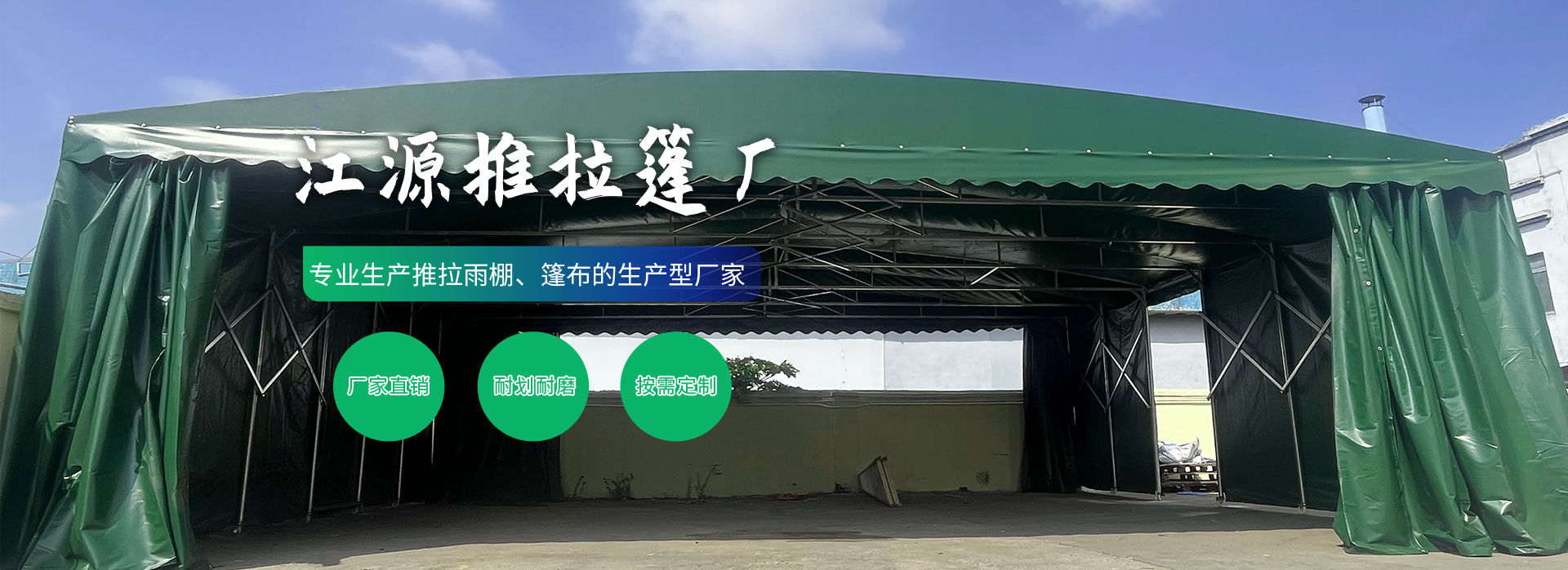 我司是一家专业生产推拉雨棚、篷布的生产型厂家,主要经营有:推拉棚、电动防雨棚、伸缩推拉篷、大型移动雨篷、伸缩雨棚、活动推拉棚、伸缩活动雨篷、大型推拉篷、电动推拉棚、伸缩推拉篷、电动伸缩雨棚、各种型号规格的篷布等....于专业生产、定制、维护于一体的实力厂家。我们有专业的团队上门测量,上门安装。公司自成立以来,不断谋求新的发展,承接了省内外数千项大型的雨棚设计与安装,掌握了各种施工技术,积累了丰富的施工经验。我司始终坚持以“客户至上,质量保证,品质为先,服务专业”为经营方针。